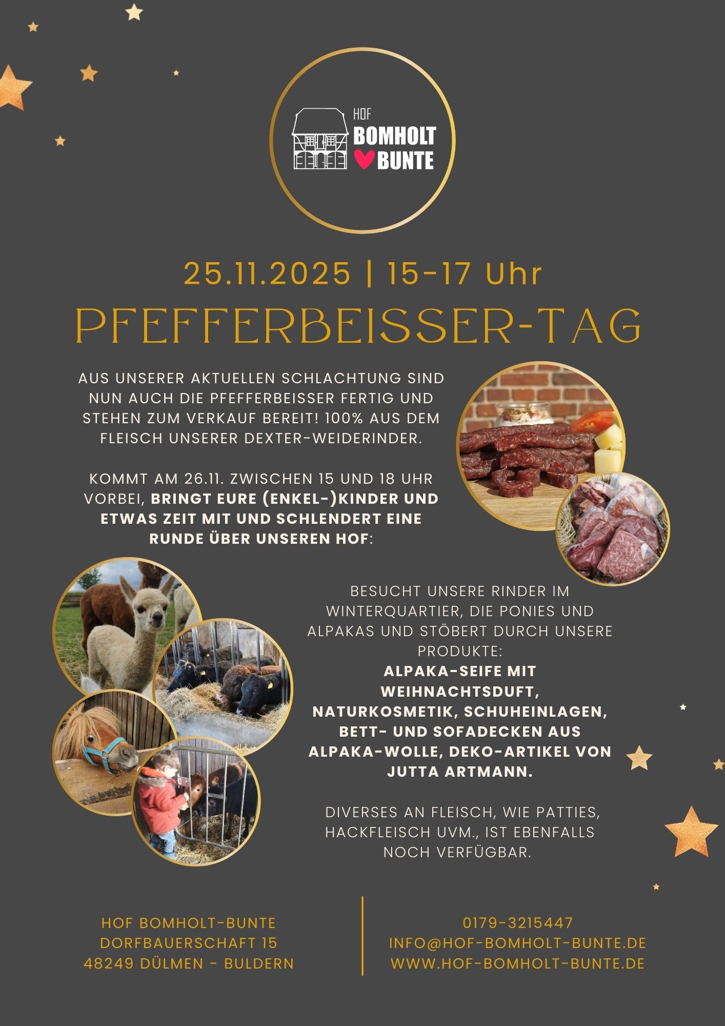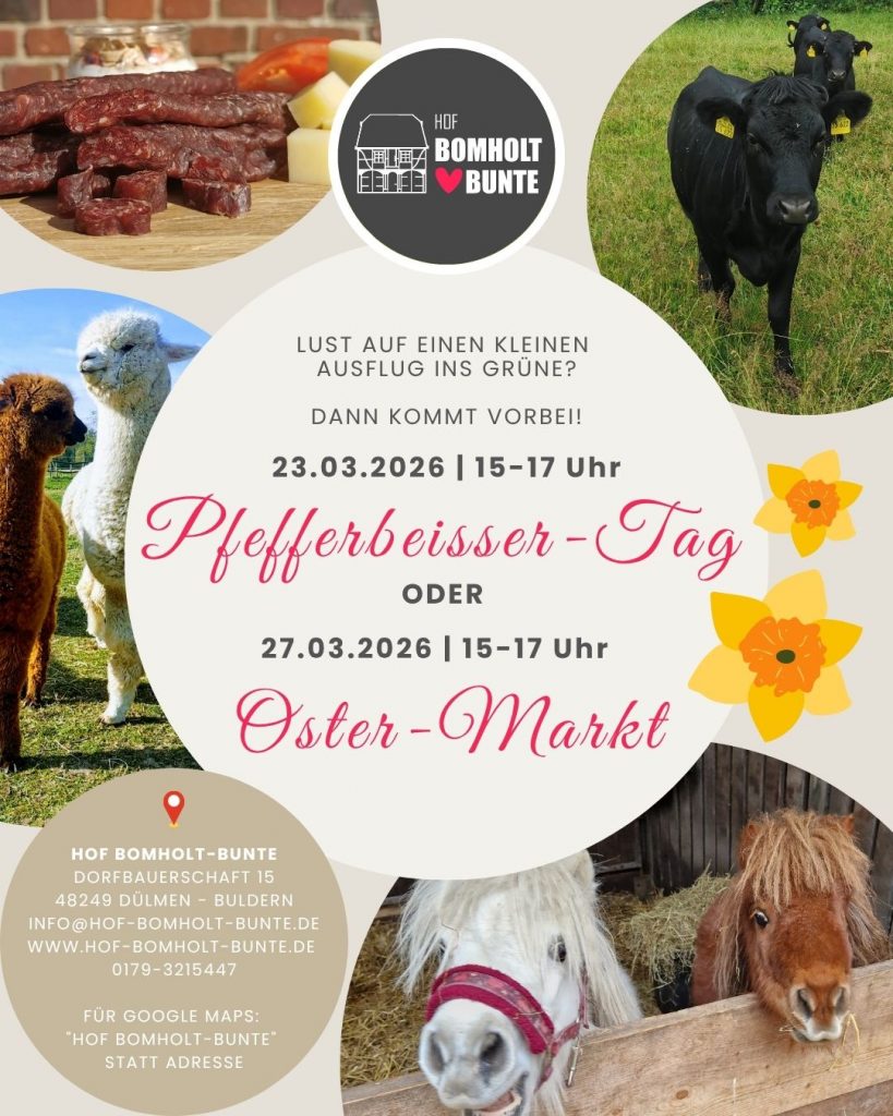 Bei uns, auf dem Hof Bomholt-Bunte, könnt ihr auch das besonders zarte und saftige Fleisch der Dexter-Weiderinder kaufen. Es zeichnet sich durch einen aromatischen Geschmack, die feine Marmorierung, einen geringeren Fettanteil und eine längere Reifung aus. Außerdem stammt es von glücklichen Tieren: Auf unserem Hof leben die Dexter fast ganzjährig auf der Weide und fressen ausschließlich Gras und Heu. Die Kälbchen bleiben mindestens bis zum sechsten Monat bei den Mutterkühen. Wollt ihr mehr über die Rasse und ihre Haltung wissen? Dann klickt hier.