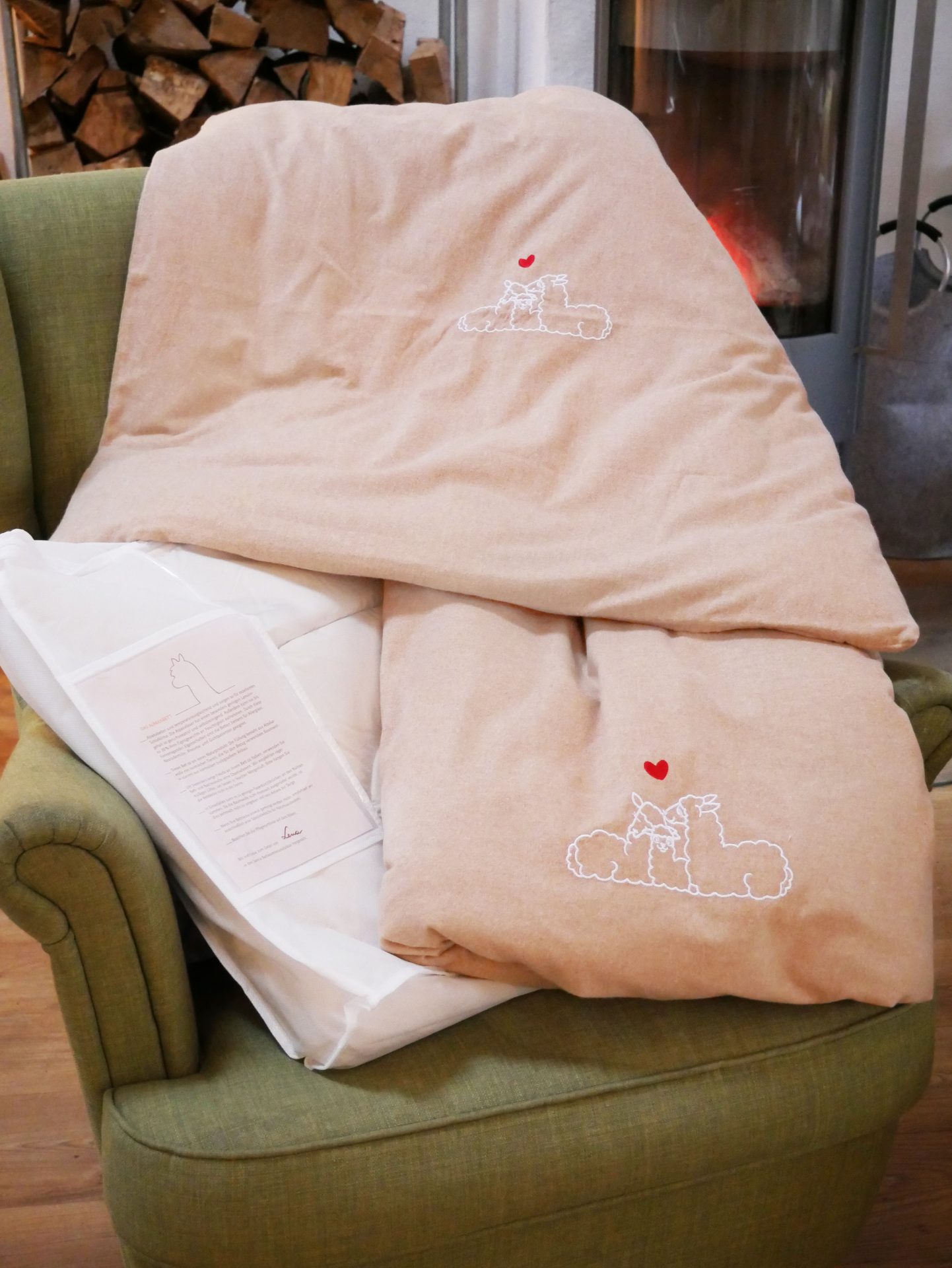 Als perfekte Ergänzung für das Alpaka-Inlett empfehlen wir unsere kuschelige Flanell-Bettwäsche, für die farbig gewachsene Baumwolle aus kontrolliert biologischem Anbau verwendet wurde. Das weiß-melierte Zimtbraun ist also die natürliche Farbe, der Bezug somit ganz frei von künstlichen Farbstoffen. Verziert wird der Bezug durch unsere eigens kreiertes Emblem, der kleinen Alpaka-Familie mit dem Herzen. Sie ist eine wunderbare Brücke, um Kindern zu erklären, wie besonders ihre Decke ist und von welchen Tiere ihre Wolle stammt. Hier könnt ihr Inlett und Bezug als Set kaufen und hier den Bettbezug einzeln.