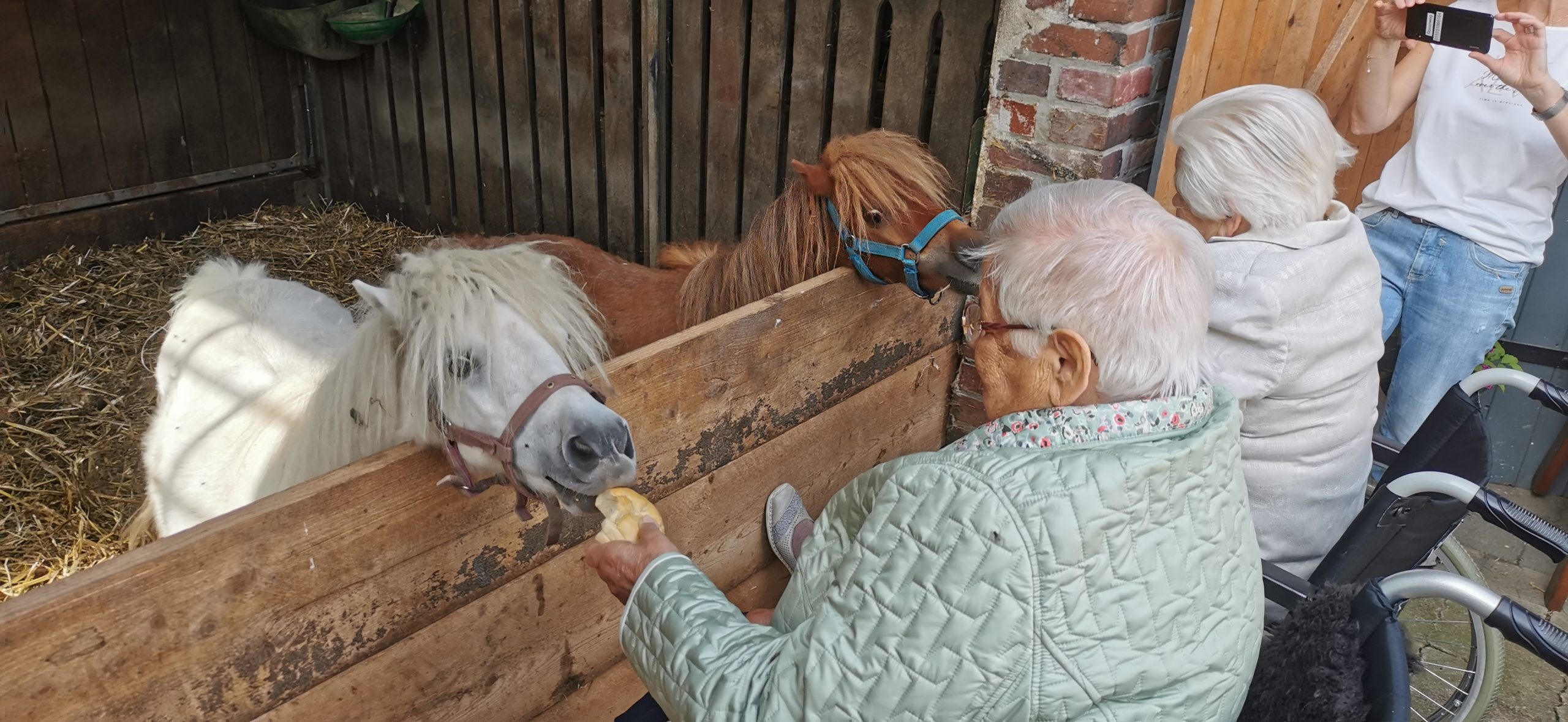 Senioren aus Tagespflegen oder Altenheimen erleben auf dem Hof Bomholt Bunte eine erholsame Abwechslung zu ihrem Alltag. Gleichzeitig können sie, entsprechend ihrer körperlichen und geistigen Möglichkeiten, selber aktiv werden und leichte Aufgaben, wie das Füttern der Tiere, übernehmen. Bewegung, die frische Luft sowie der Kontakt mit Tieren regen ihre Sinne und Emotionen an, lassen vielleicht auch persönliche Erinnerungen wach werden und bringen den Kreislauf in Schwung.